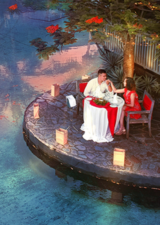 Tired of tasteless resort food, unchanging breakfasts, generic restaurant interiors? Four distinctive restaurants — Asian-Seafood by the sea, with indoor or under-the-stars dining; elegant Mediterranean-Steak in a stunning Art Nouveau setting; an authentic American Diner; and a fresh-air International coffee shop surrounded by the main swimming pool and the saltwater lagoon. And a daily-changing themed breakfast buffet, a less-expensive ala carte option, or just a coffee-and-Danish. Click here to learn more about our food.