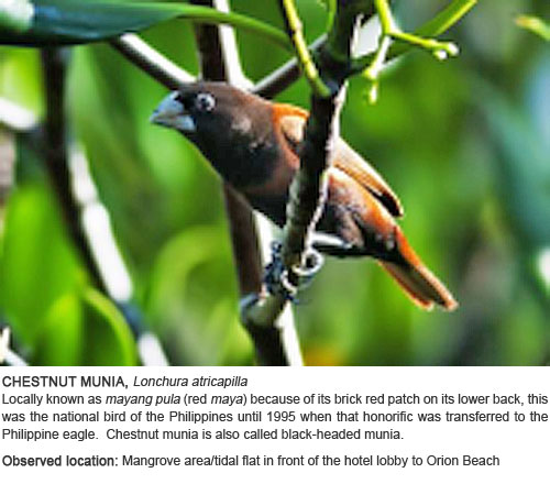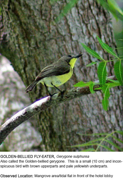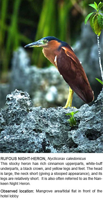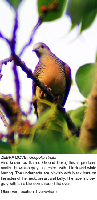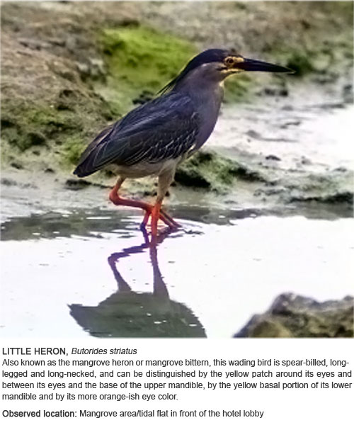 Venture out of your room and go on a wildlife adventure without leaving the resort. Just equip yourself with our field guide and binoculars (available at the Gameroom) and your camera, and discover the joy of birding.