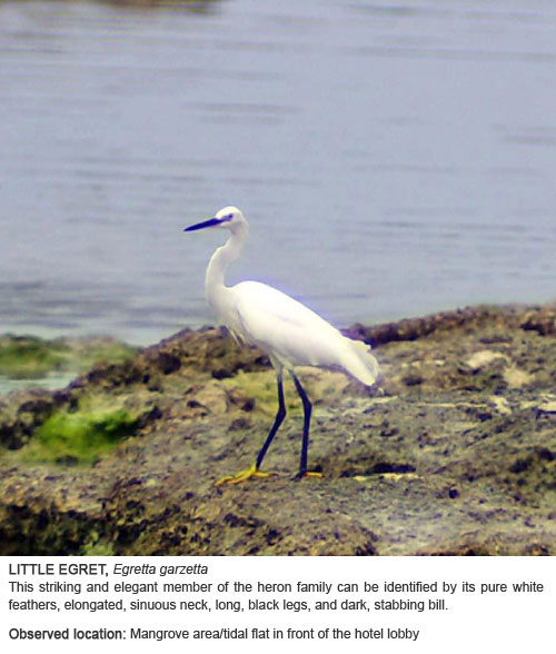 The resort is also a favorite stopover for migrating birds. From time to time, we have the Blue-tailed Bee Eater in addition to the usually solitary Little Egret and Little Heron and the gregarious Common Sandpiper.