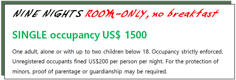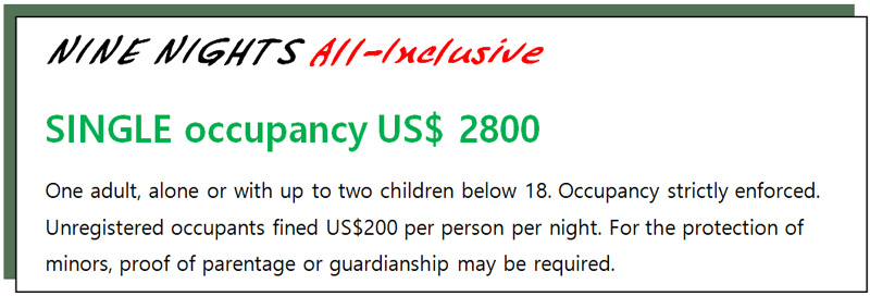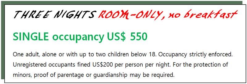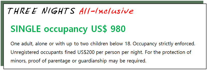 This room-only, one-adult only offer is designed to give solo travelers and single parents a break for a change – a lower price than the usual room rate for double occupancy. This offer is paired with our Upper-Level Beachside Rooms. With taxes and service, 3 nights would normally cost US$ 775 for this room, but your charge under this deal is just $550.